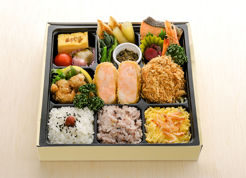 ・海老かつ ・やわらかヒレかつ ・鶏の竜田揚げ ・白米 ・に十五穀米 ・桜海老と錦糸玉子のご飯 ・筍の土佐煮風 ・蕗の煮物 ・菜の花 ・会津天宝ふきのとう味噌 ・焼き鮭 ・柴漬け ・殻付き海老 ・厚焼き玉子 ・プチトマト ・桜餅