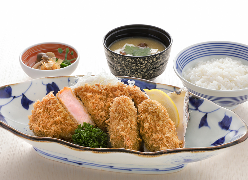 カキフライ2個、ロースかつ、ご飯、みそ汁、おひたし