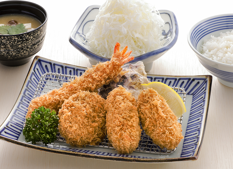 カキフライ2個、海老フライ、ヒレかつ、ご飯、みそ汁、おひたし