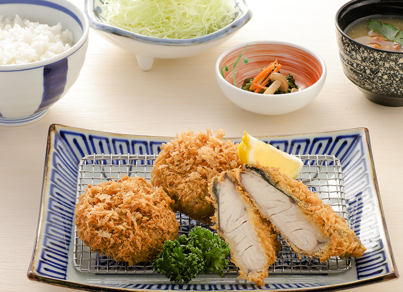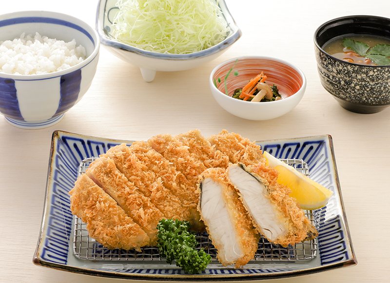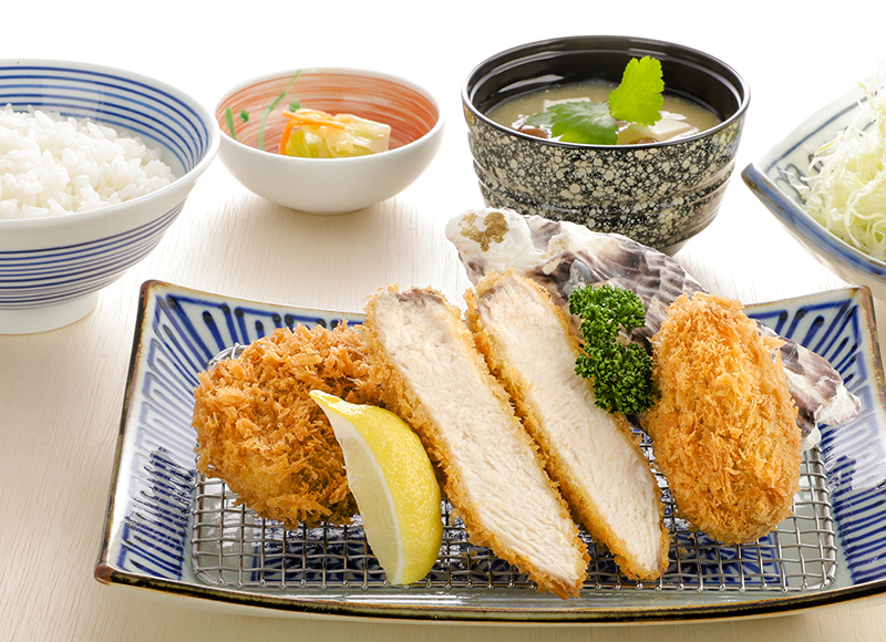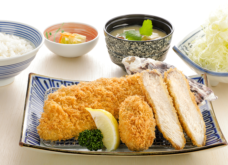 ぶりかつ、カキフライ、ヒレかつ、ご飯、みそ汁、お新香