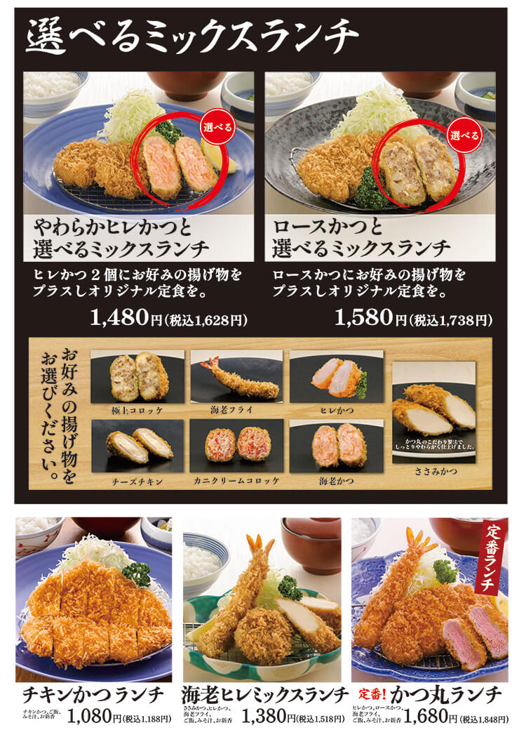 旨いとんかつと海老フライをメインに、シンプルな定食やボリューム満点のセットメニュー、さらにランチ限定のお得なメニューを、平日11:00~14:59までリーズナブルなお値段でご提供いたしております。