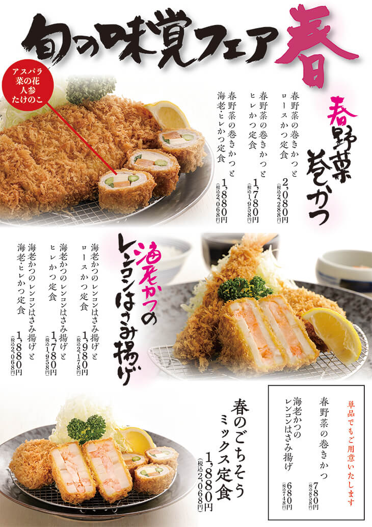 アスパラ、人参、筍をやわらかヒレで巻いた「春野菜巻きかつ」と、たっぷりの海老をレンコンに挟んだ「海老かつのレンコンはさみ揚げ」を、自慢のとんかつや海老フライと組み合わせてご提供いたします。