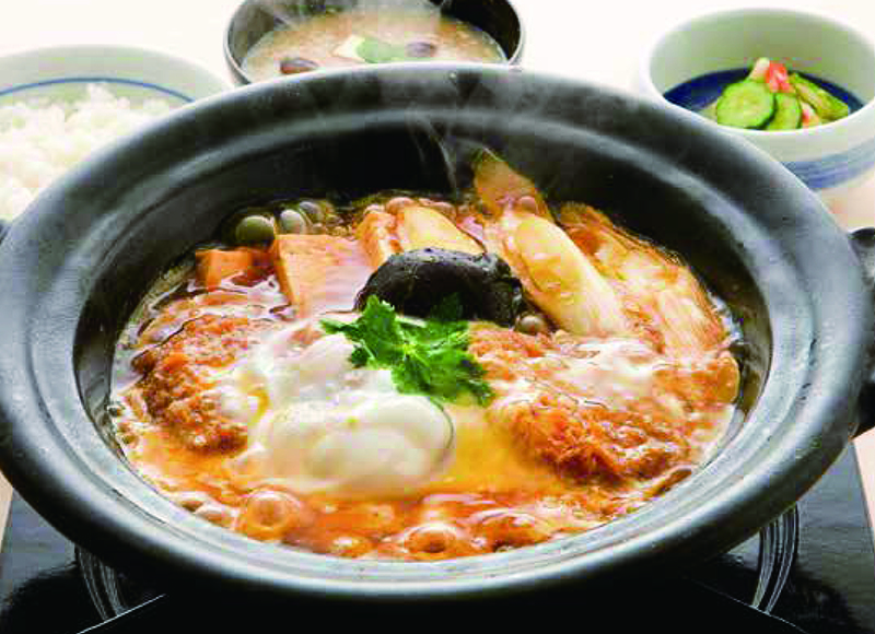 カキフライとヒレかつ鍋、ご飯、みそ汁、お新香