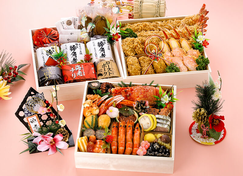 今年も人気のジャンボ海老おせちをはじめ、お求めやすいとんかつおせちと最高級の食材を集めた極上おせち三段の3種類をご用意いたしました。